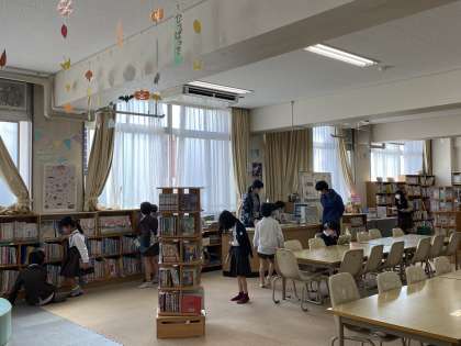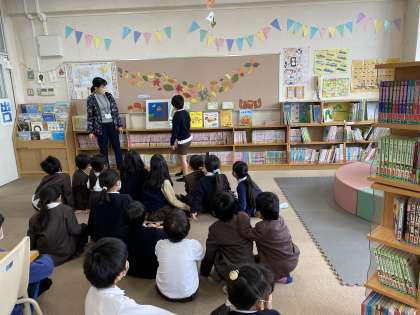 毎週水曜日は、「学校図書館補助員」の下澤さんに来ていただき、読み聞かせや本の紹介などをしてもらっています。その後、それぞれ好きな本を読んだり借りたりしました。