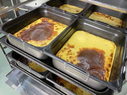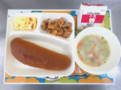 【黒糖パン、牛乳、豚肉のケチャップソテー、コーンスープ、焼きプリン】