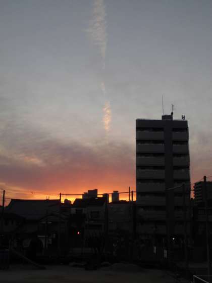 (職員室から見えた、きれいな夕焼けと偶然見れた飛行機雲とともに)