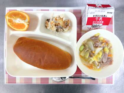 【黒糖パン、牛乳、押麦のグラタン、スープ、いよかん】