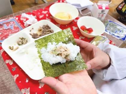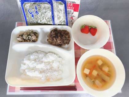 【手巻きご飯(牛肉の甘辛焼き、ツナソテー)、すまし汁、いちご、牛乳】