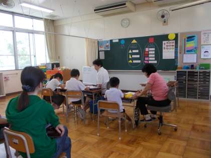 5年、6年、ひまわり学級は、それぞれ、算数科、総合的学習、英語活動などを見てもらいました。そのあと「フルーツバスケット」(5年生)、「バスケットボール」(6年生)で楽しみました。どの学年も親子が楽しく活動するとともに、親同士のネットワークも広がりました。