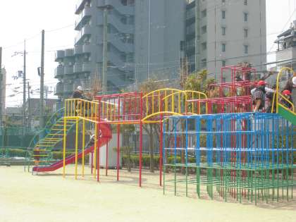 バスケットボールをする中学年、ジャングルジムで遊ぶ低学年、