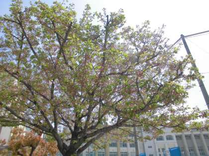 数多くの花びらが花吹雪と散り、新緑の葉っぱが目立ってきました。