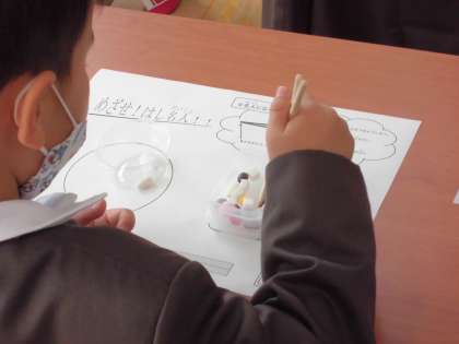 お箸を使って、豆に見立てた物を右から左へ、左から右へ
