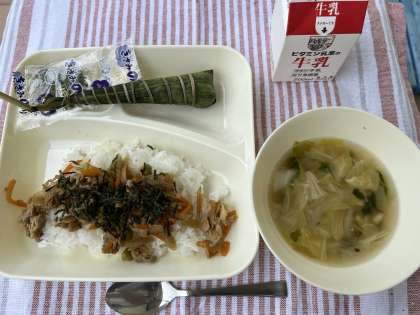 【きんぴらちらし、すまし汁、ちまき、牛乳】