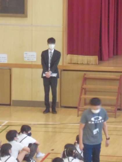 児童朝会「マスク着用について」「教育実習生の自己紹介」