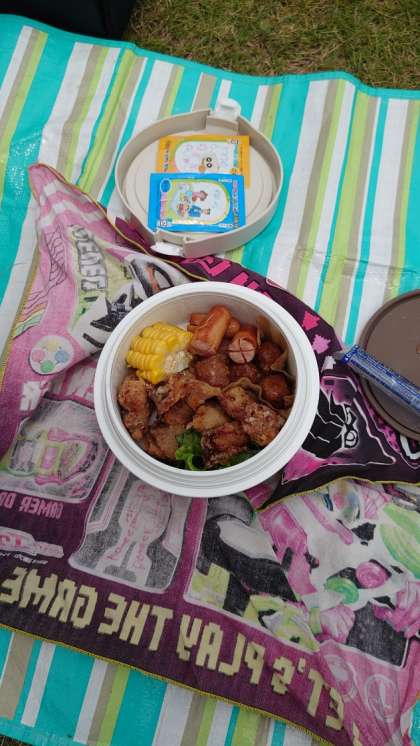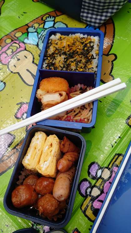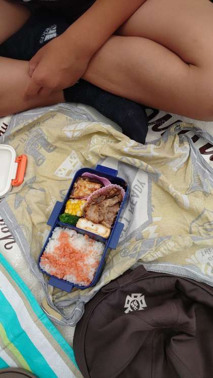 青空がちらっと見えるまでお天気が回復したので、外の芝生広場でお弁当を食べています。