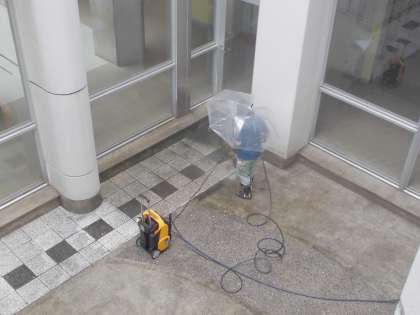 管理作業員が、中庭を高圧洗浄機できれいにしています。