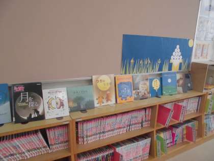 主幹学校司書が、月の掲示と、月に関する図書を集めて、
