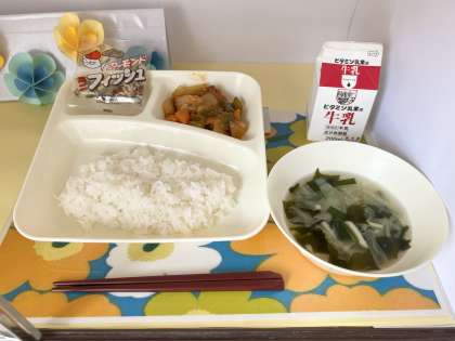 【ごはん、牛乳、酢豚、中華スープ、アーモンドフィッシュ】