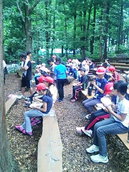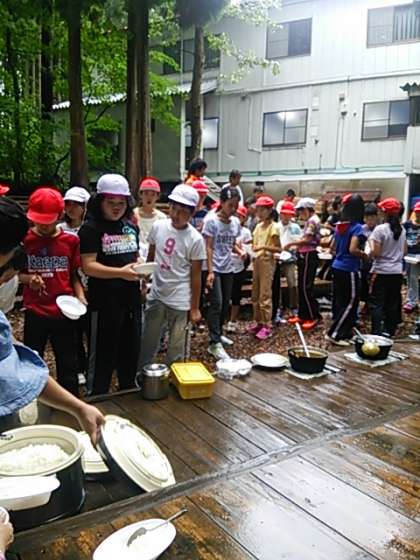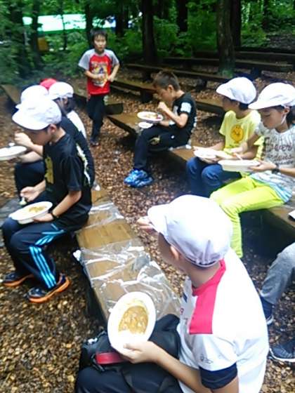 少し雨もおさまってきたので、できあがったカレーを外で食べます。おかわりもあります!さて、自分たちで作ったカレーのお味はどうでしょうか?