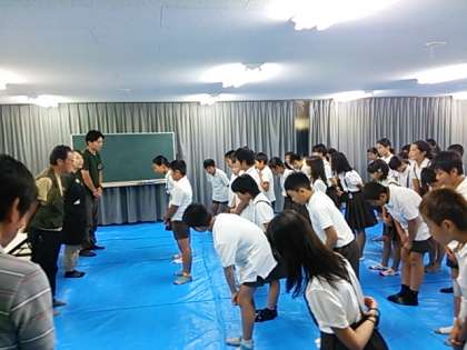最後の閉舎式です。2泊3日、お世話になったヒュッテやまなみのスタッフの皆さんに、感謝の言葉をお伝えしました。やまなみさん、おいしいお食事に、たくさんのすばらしい思い出、本当にありがとうございました! みんなまだまだ元気いっぱい、これからバスに乗って大阪へ帰ります!