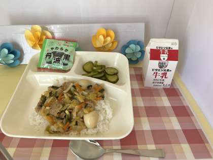 【中華丼、牛乳、きゅうりのピリ辛あえ、ソフト黒豆】