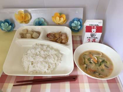 【ごはん、牛乳、鶏肉の甘辛焼き、みそ汁、