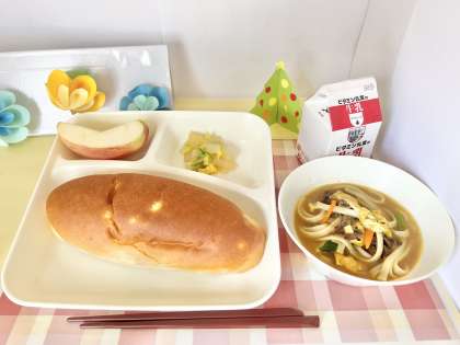 【おさつパン、牛乳、カレーうどん、はくさいのおひたし、りんご】
