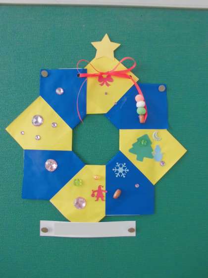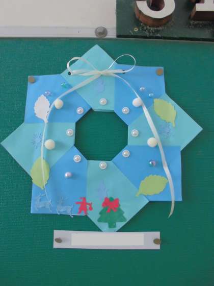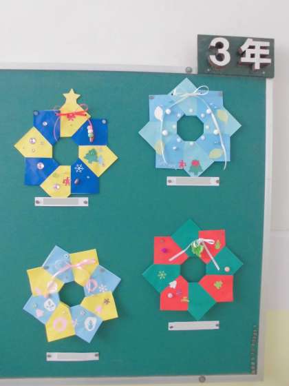 階段掲示板の掲示物(4年生)【図画工作科】「クリスマスリース」