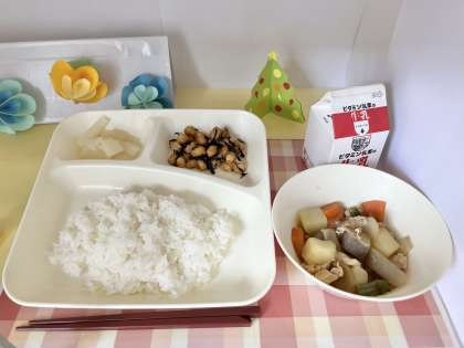 【ごはん、牛乳、豚肉と野菜の煮もの、ひじき豆、