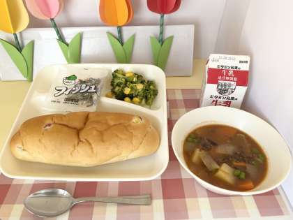 【おさつパン、牛乳、ビーフシチュー、