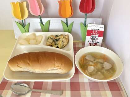 【こくとうパン、牛乳、ほたて貝のグラタン、スープ、