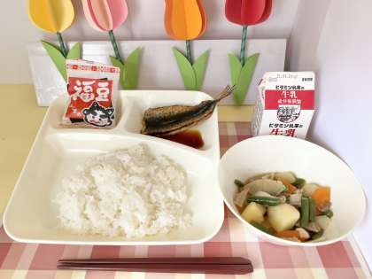 【ごはん、牛乳、いわしのしょうがじょうゆかけ、含め煮、