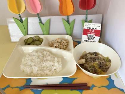 【ごはん、牛乳、すき焼き煮、きゅうりのゆず風味、