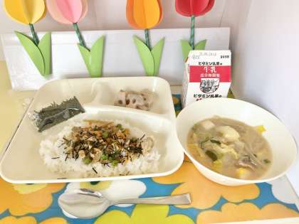 【鶏ごぼうご飯、牛乳、とうふのみそ汁、焼きれんこん】