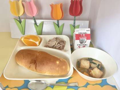 【おさつパン、牛乳、豚肉のオイスターソース焼き、