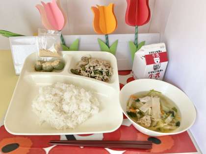 【ごはん、牛乳、豚肉と野菜のいためもの、すまし汁、