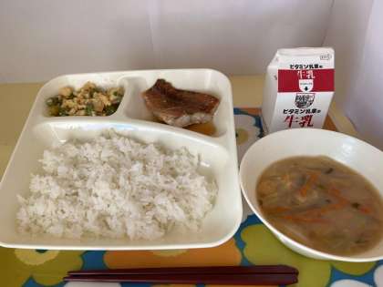 【ご飯、牛乳、あかうおのしょうゆだれかけ、みそ汁、えんどうの卵とじ】