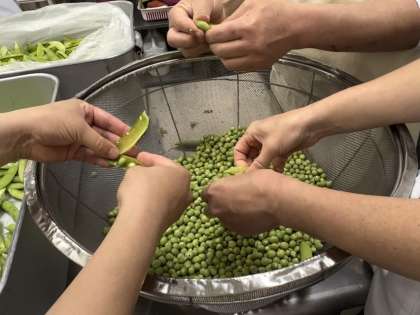 調理従事者が、1つずつさやから取り出した、生のえんどうを使っています。