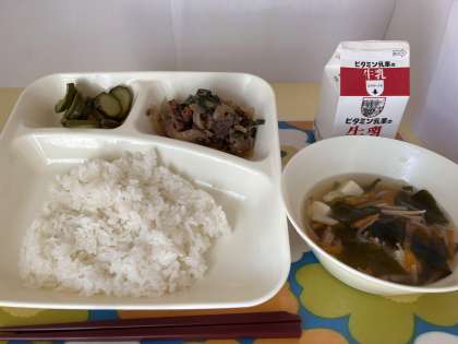 【ごはん、牛乳、プルコギ、とうふとわかめのスープ、きゅうりの甘酢づけ】