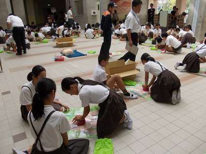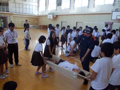 東成消防署のレスキュー隊の方からは、救命法の心臓マッサージについて、ていねいに教えていただきました。また、毛布を利用した担架の作り方や、ケガをした人の安全な運び方なども体験し、どの児童も真剣に取り組む姿が見られました。