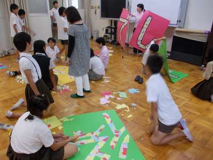 10月4日の運動会が近づいてきました。児童みんなで考えた今年の運動会のめあては、「全力出して 最後まで」です。6年生児童が、全紙に大きな文字を貼ってめあてを完成させました。当日、このめあての達成に向け、最後まで力を出し切る姿が見られるといいですね。