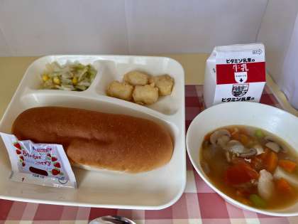 【コッペパン、いちごジャム、牛乳、いかてんぷら、