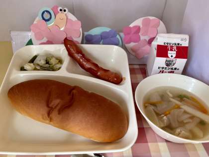 【黒糖パン、牛乳、ウインナーのケチャップソース、スープ、