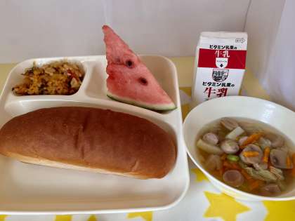 【黒糖パン、牛乳、パエリア、ウインナーとキャベツのスープ、すいか】