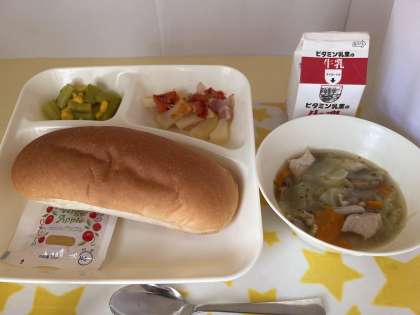 【コッペパン、りんごジャム、牛乳、鶏肉とてぼ豆のスープ煮、じゃがいもとトマトのチーズ焼き、グリーンアスパラガスとコーンのサラダ】