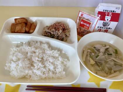 【ごはん、牛乳、ゴーヤチャンプルー、五目汁、あつあげのしょうがじょうゆかけ】