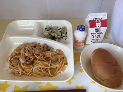 【黒糖パン、牛乳、チキントマトスパゲッティ、発酵乳、