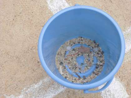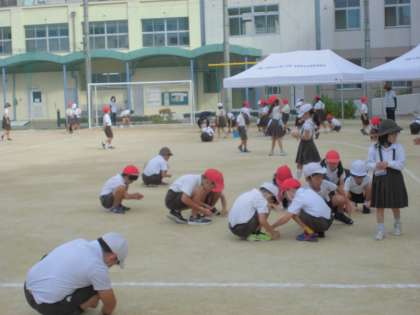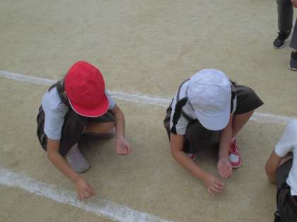 先日の「児童朝会」で、運動場の「石拾い」をしました。