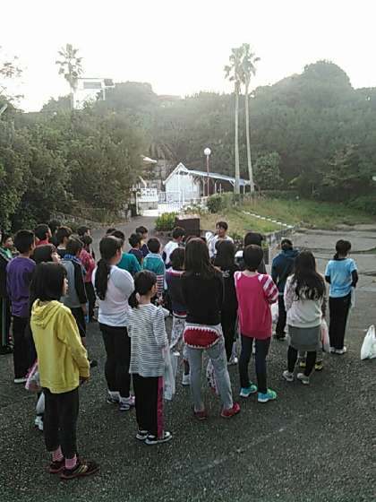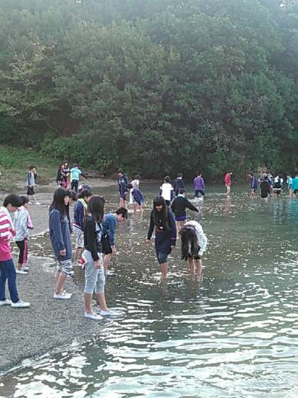 16日(金)。朝は、ホテルの近くの砂浜広場にて、体操・磯歩きです。今日も秋晴れのとっても良い天気です。きれいな海を歩いていると、ついつい足をつけたくなります。