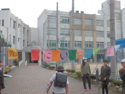 正門入った所で児童会の代表の児童と登校してきた児童が