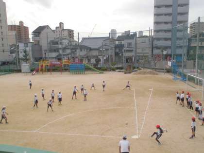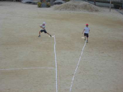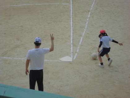 ボールを蹴った後、ベースに走ってくる子どもと、