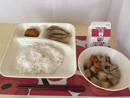 今日の給食には、かぼちゃ(なんきん)、にんじん、れんこんが登場しました。