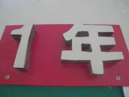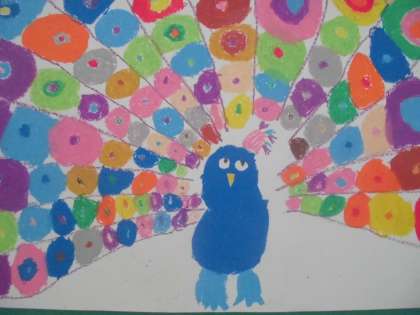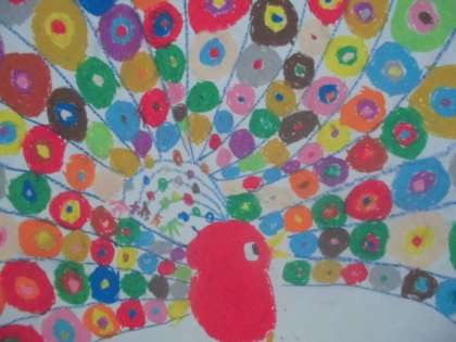 階段掲示板の図画作品、1年生の「孔雀」です。