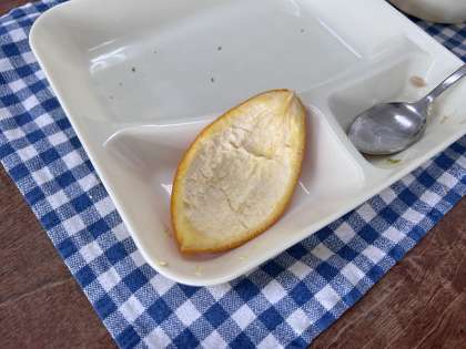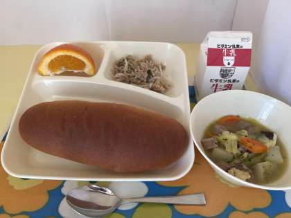 【黒糖パン、牛乳、ポトフ、ツナと野菜のソテー、いよかん】