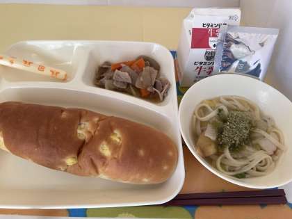 【おさつパン、牛乳、豚肉とごぼうの煮もの、なにわうどん、棒チーズ】