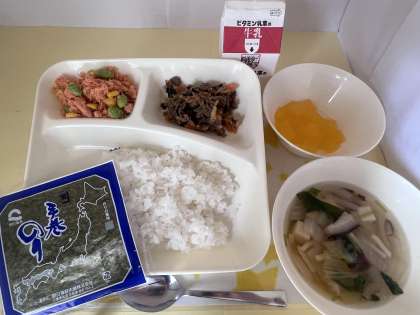 【手巻きご飯(牛肉のコチジャンいため、さけのカラフルそぼろ)、牛乳、