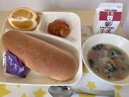 【コッペパン、ブルーベリージャム、牛乳、えびのチリソースいため、